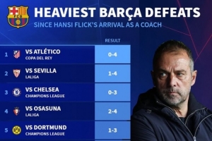 弗里克时代巴萨最大比分输球:0-4马竞创纪录,仅5场净负至少2球