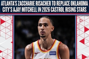 体育资讯2月11日讯 NBA官方宣布,24年状元秀老鹰前锋里萨谢将顶替雷霆后卫阿杰伊·米切尔,加入麦迪执教的Team T-Mac,出战2026年全明星新秀挑战赛。
